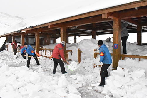 長白山冬季漫長,雪量極大,西景區各候車回廊經過一冬天風雪“洗禮”,積雪已超過一人多高。為迎接“五一”小長假,確保旅游安全有序,景區運營三部抽調經理級管理人員、調度員、駕駛員共計20余人,組建清雪專班。專班人員分工協作,一組負責拴好安全繩推落棚頂積雪,另一組一鍬鍬鏟除積雪,汗珠常常掛滿額頭,濕透棉衣。隊員們起早貪黑、加足干勁、就地進餐,他們既承擔起高強度作業,又承受著積雪反射紫外線對皮膚造成的傷害,經過一周“浴雪奮戰”,王池、峽谷、換乘和主峰等景點候車回廊積雪已全部清理完畢。